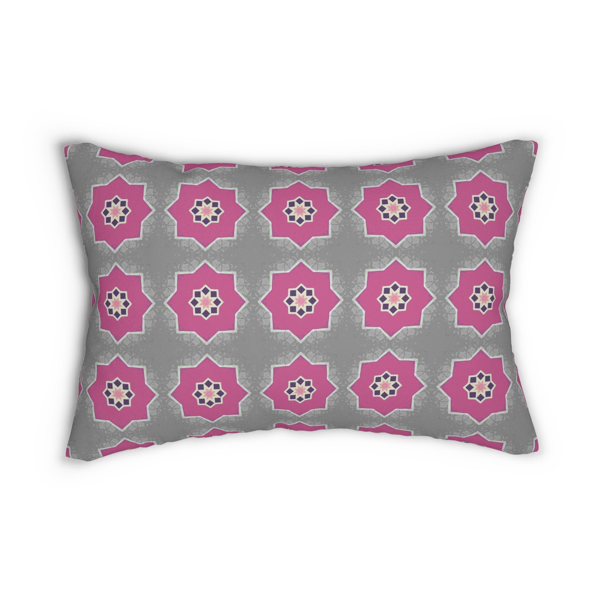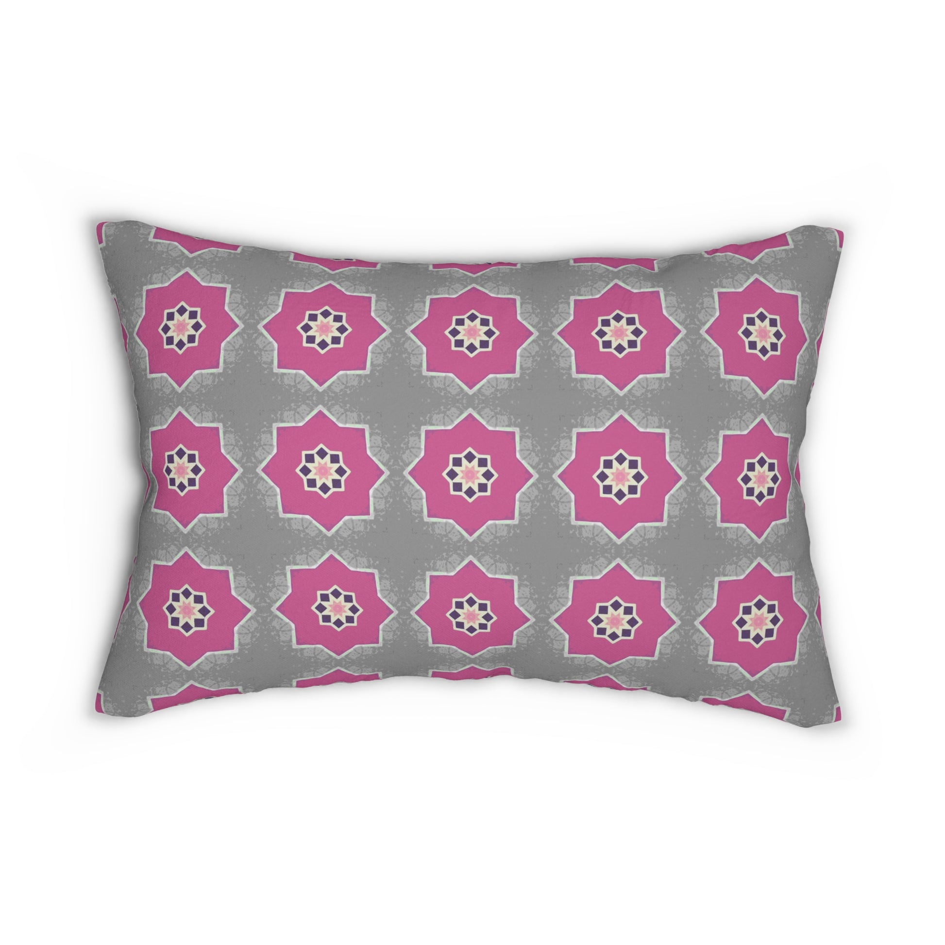 Add a bold and playful touch to your decor with this pink and gray floral pattern lumbar pillow, featuring a repeating geometric flower tile print that seamlessly blends modern style with a hint of Moroccan influence. The soft gray background contrasts beautifully with the vivid, starburst-like pink flowers, creating a look that’s both contemporary and feminine.